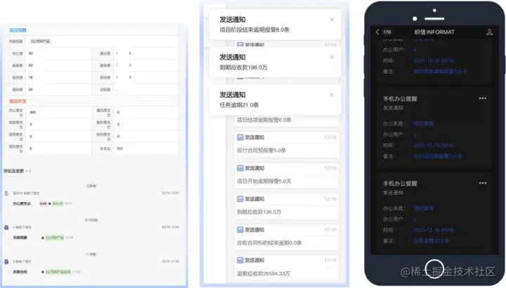 自定义更改项目内容申请流程,当出现项目支出超出预算,收款,付款,项目逾期,安全问题,可设定预警值,超出安全预警后,将会在PC与移动端推送提醒。