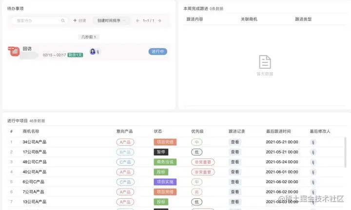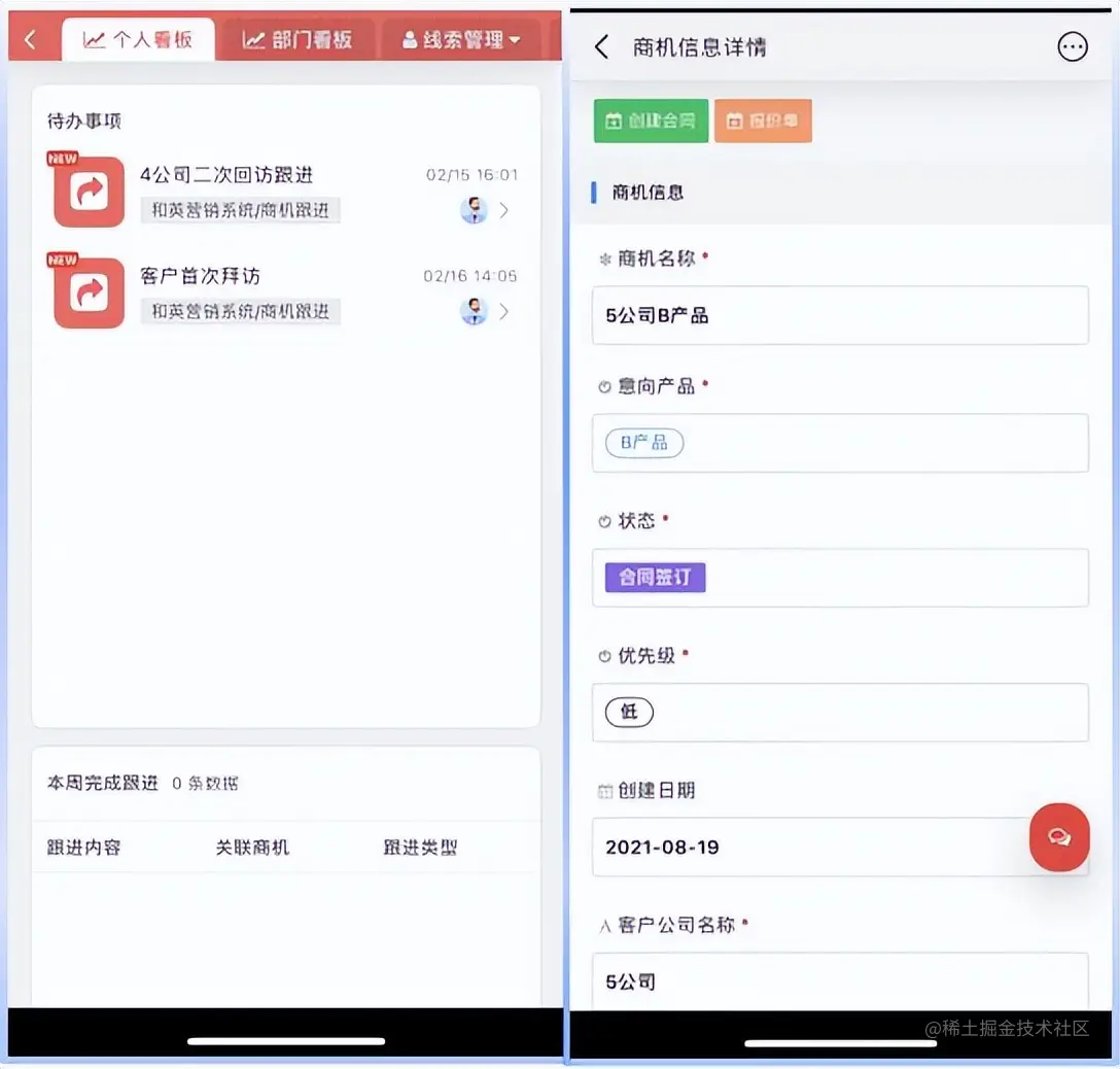 销售通过个人看板查看自己需要跟进的项目,记录每次跟进客户的信息,商机关联后续合同与报价。