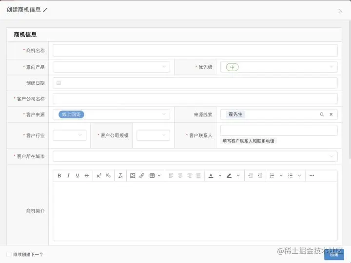 业务人员通过回访跟进线索,筛选商机,创建商机(客户信息)