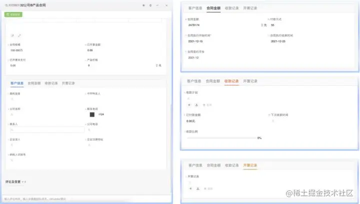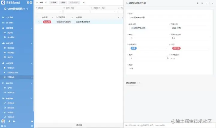 销售人员和管理者可在合同处直接查看客户,合同金额,收款记录,开票记录。