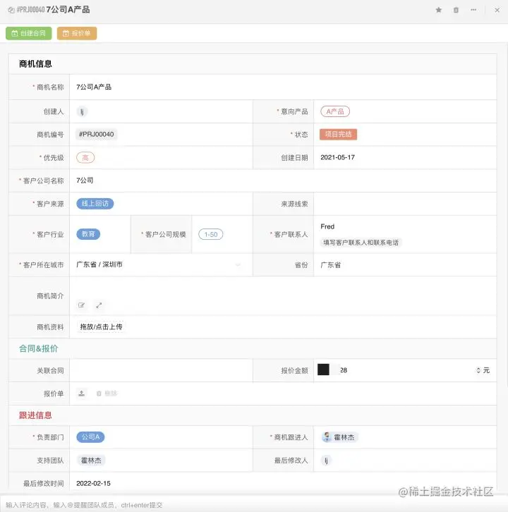 客户成单后,销售人员进行创建合同信息,可以把合同会关联商机与报价。