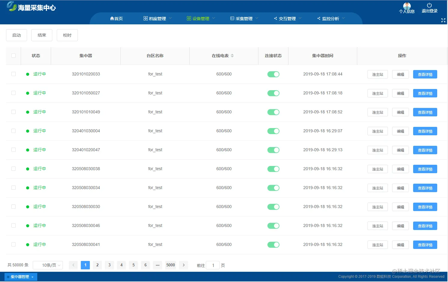| 通过上述分析可得出以下结论:1、海量用电信息采集与管理平台,能够满足50000台物理集中器、3000万台智能电表接入与日常数据采集要求,通过集群化部署,可支持接入设备的无限扩展。2、dgiot海量用电信息采集与管理平台,单台测试机可支持省级用电信息采集业务的稳定开展。 |