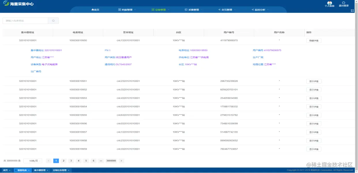 | 数据展示 | 用户登录系统查看用电信息采集数据,可以查看每个电能表的采集结果 | 10% | 5万集中器、3000万电能表 |