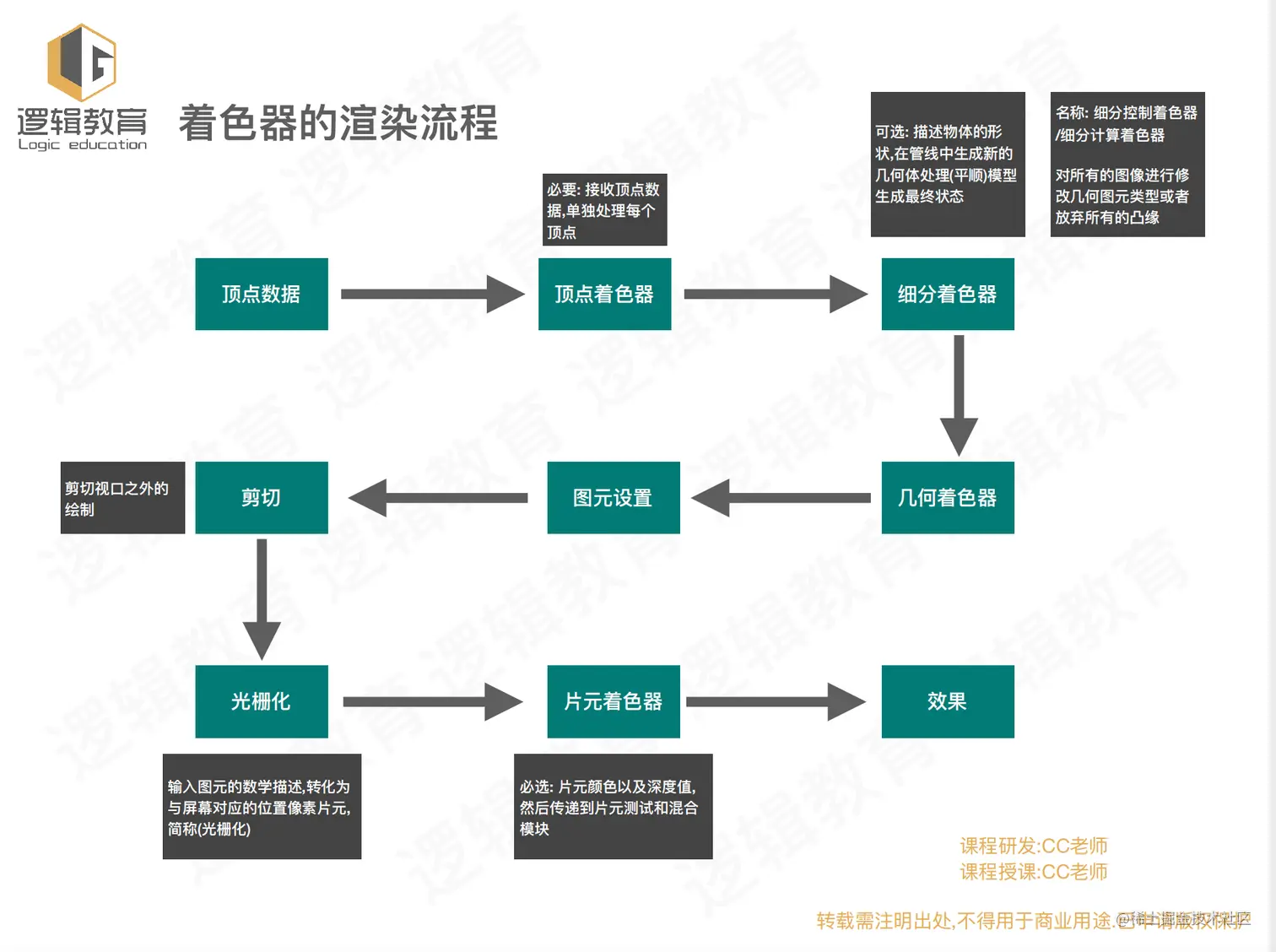 · 在OpenGL下渲染图形,就会经历一个又一个的节点,而这样的操作可以理解为管线。管线是一个抽象的概念,之所以称之为管线是因为显卡在处理数据的时候是按照一个固定的顺序进行的,而且严格按照这个顺序。