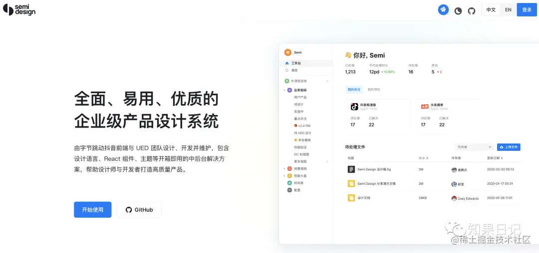 SemiDesgin官方解释:SemiDesgin由是字节跳动抖音前端与UED团队设计、开发并维护,包含设计语言、React 组件、主题等开箱即用的中后台解决方案,帮助设计师与开发者打造高质量产品。
