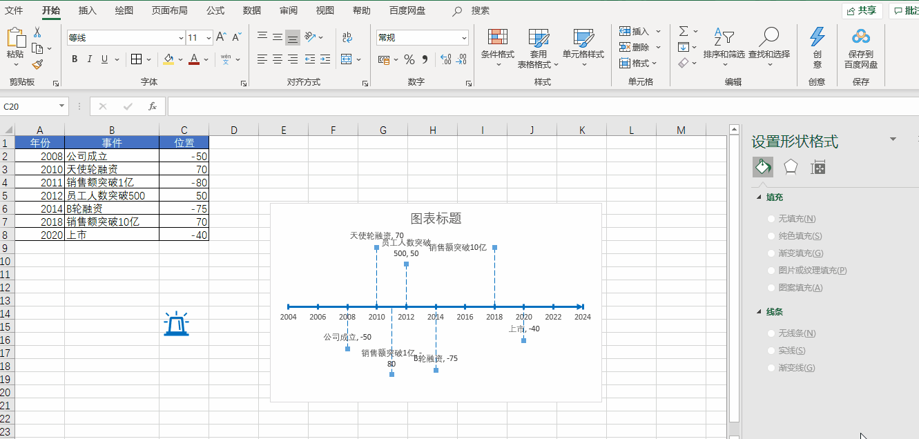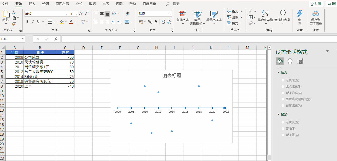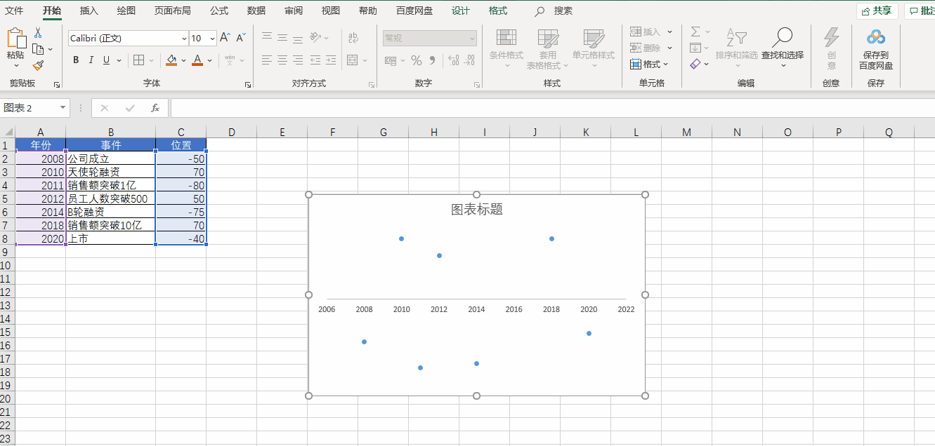 先插入一个空白散点图,然后将 X 轴设置为【年份】,Y 轴设置为【位置】,再把 Y 轴和网格线都删除