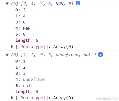 console.log(arr); //[1, 2, 空, 3, undefined, null]