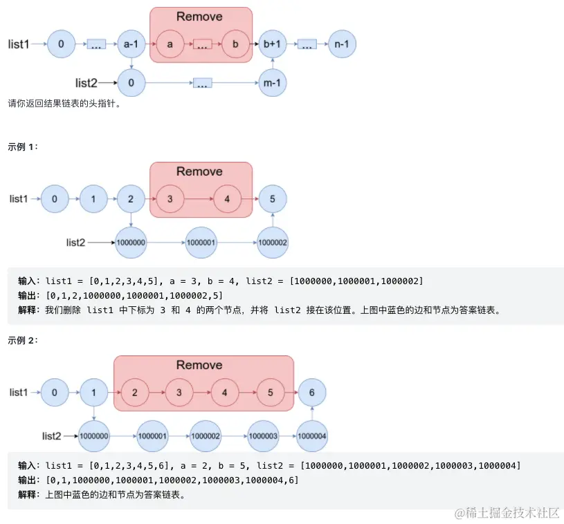 请你将 list1 中下标从 a 到 b 的全部节点都删除,并将list2 接在被删除节点的位置。