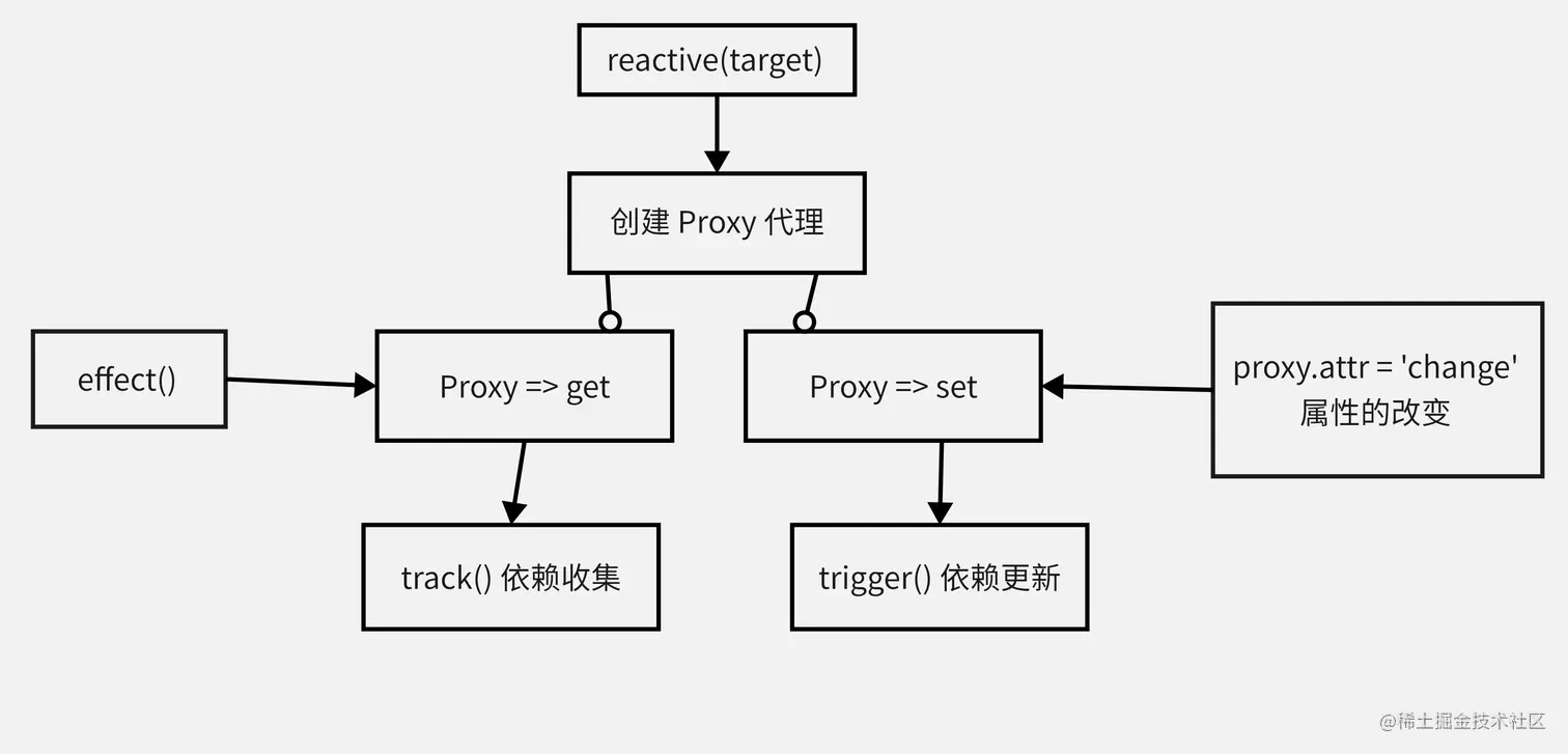 - 调用 reactive() 返回一个 Proxy 代理对象,并劫持对象的 get 与 set 操作