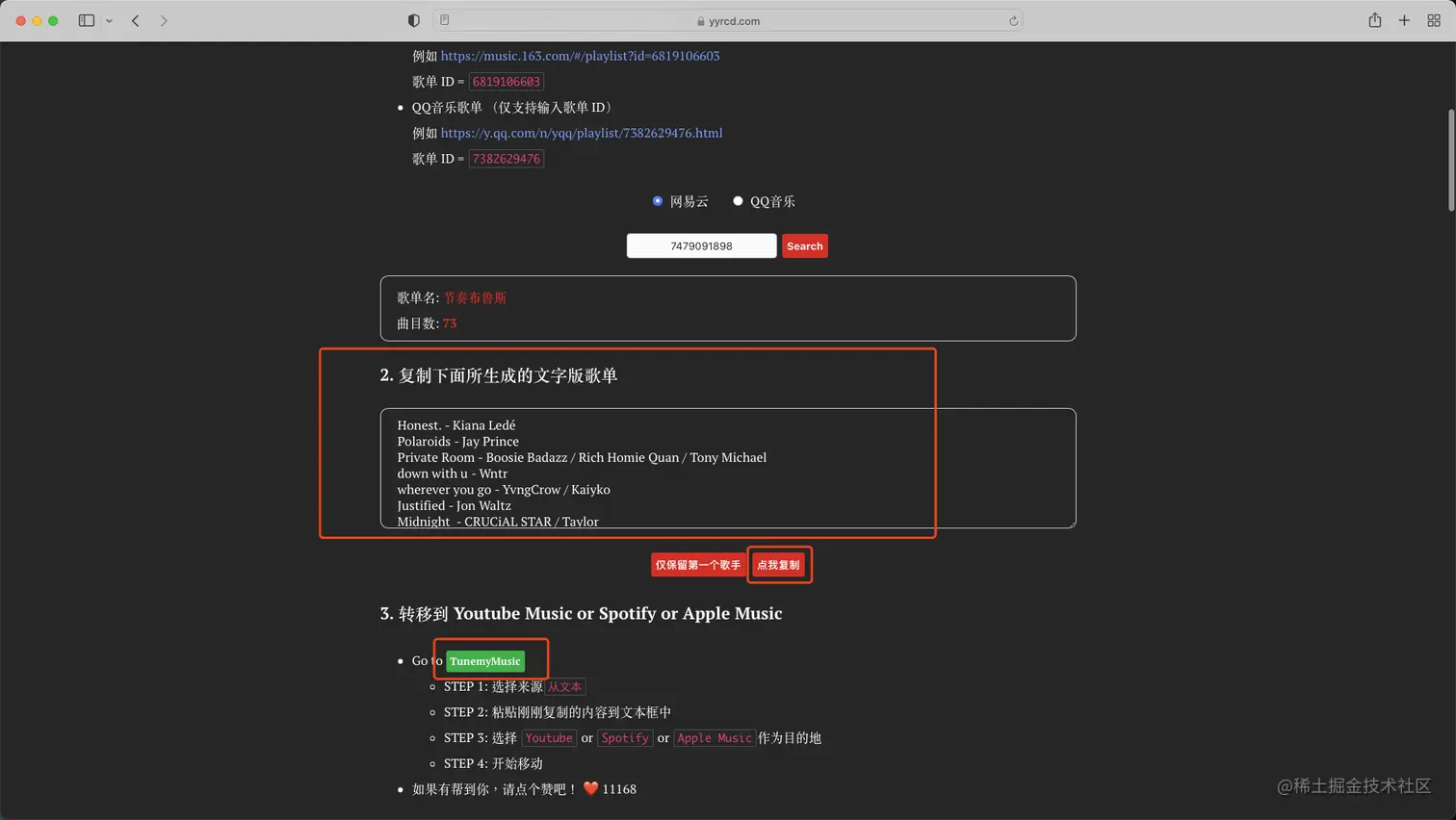 3.成功生成歌单后,点击复制。然后点击TunemyMusic跳转