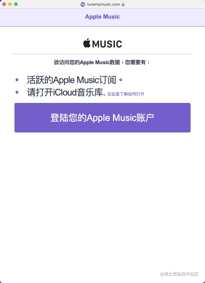 5.接下来选择目的地,这里选择Apple Music,此时会跳出一个绑定Apple账号的窗口,输入信息登录即可