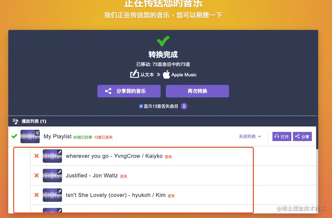 文中以英文歌单测试,转移成功的歌曲基本上是正确的,而转移中文歌单时,转移后歌单的歌曲正确率并不高,其中包含了大量不存在的歌曲,而且是重复插入的。此方法见仁见智,秉持娱乐的态度便好,期待大家分享更高效的方法