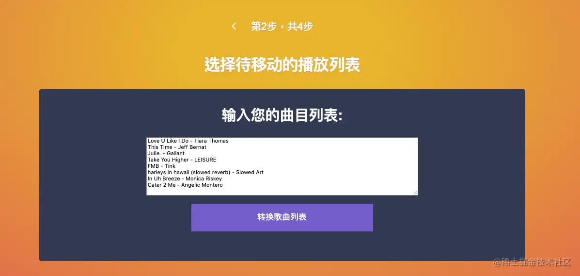 4.跳转网站后,点击开始,来源选择从文本,复制提前生成好的歌单等待转换成歌曲列表