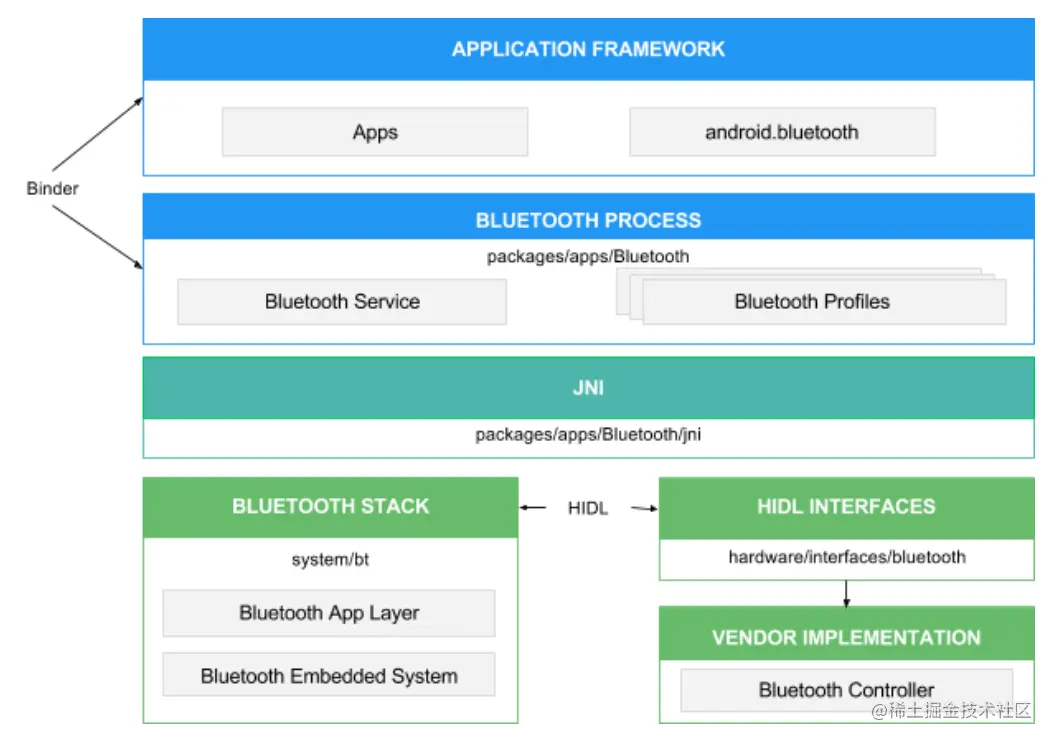 packages/apps/Bluetooth中)被打包为Android应用,并在Android框架层实现蓝牙服务和配置文件。该应用通过JNI调用HAL层。 -