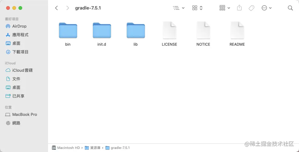 将安装包解压到想要放置的目录,这里选择 /Library/gradle-7.5.1