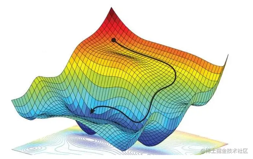 向量是特殊化的梯度,也就是导数变化最快的那个方向,首先看一个梯度下降的图,这个图也是我在其他地方找的一张图,也就是线性回归的里面的损失函数图。