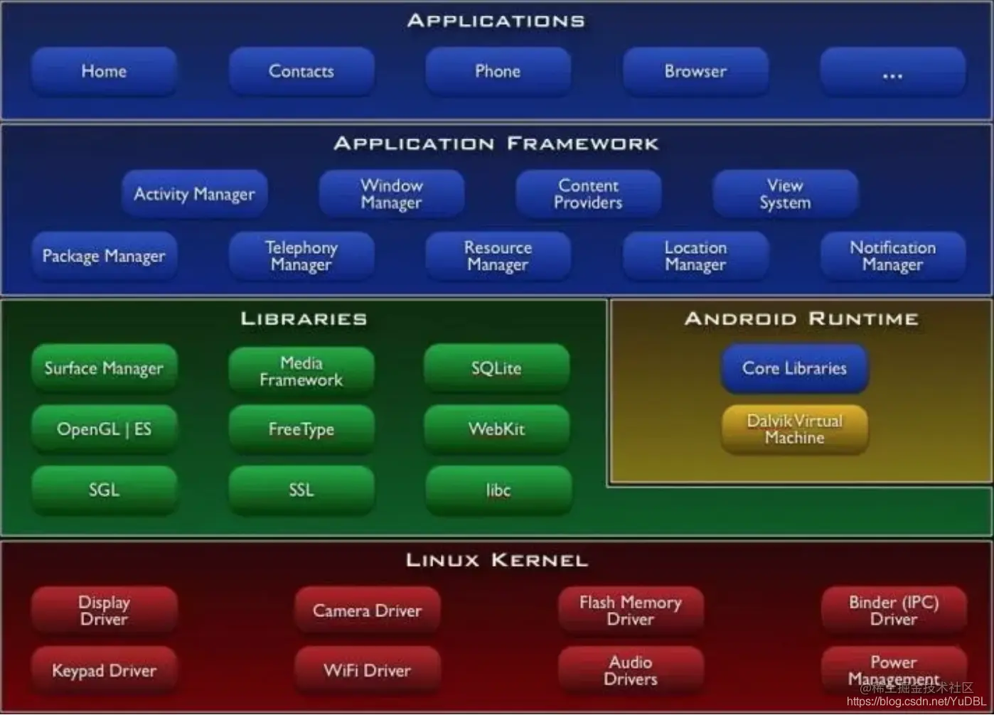 首先,我们来看一下我们刚开始学习Android就需要了解的一张图,Android系统架构图