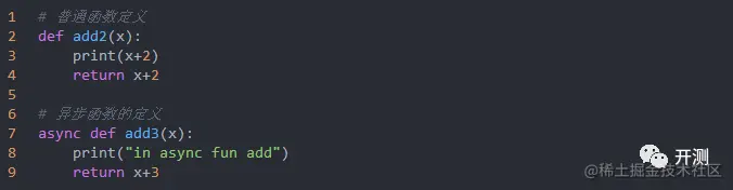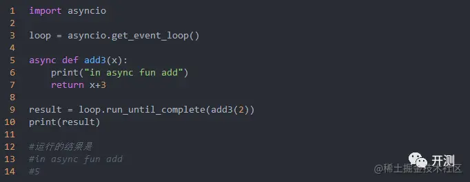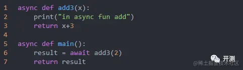 或者使用await 关键字来修饰函数的调用,如result = await add3(2),但是await只能用在协程函数中,所以想要用await关键字就还需要定义一个协程函数