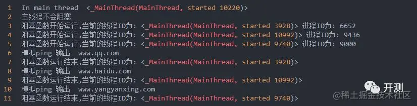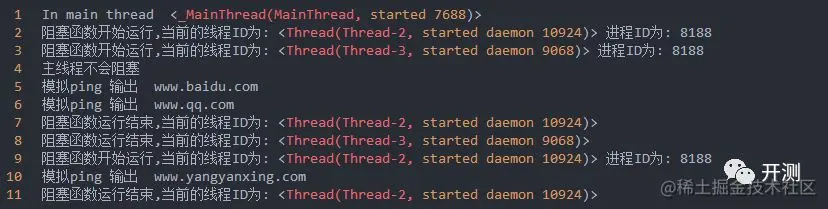 由于使用ping 命令得到很多输出,所以我对函数稍稍做了修改,只是模拟打印了一行文字,但是函数中的time.sleep(2) 这个是一个阻塞式的函数。