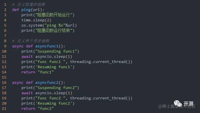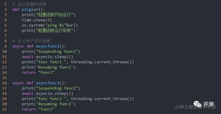 普通函数的定义是使用 def 关键词,异步的函数,协程函数(Coroutine)本质上是一个函数,特点是在代码块中可以将执行权交给其他协程,使用async def 来定义