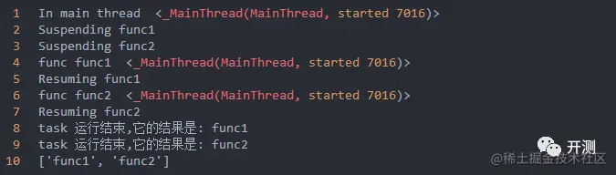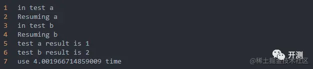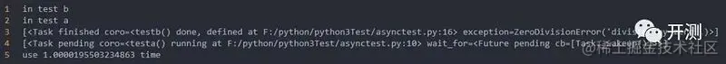 可以看到,testa和testb是同步在运行,由于testb只sleep了1秒钟,所以testb先输出了Resuming b,最后将每个协程函数的结果返回,注意,这里是gather()函数里的每一个协程函数都执行完了,它才结果,结果是一个列表,列表里的值顺序和放到gather函数里的协程的顺序是一致的。