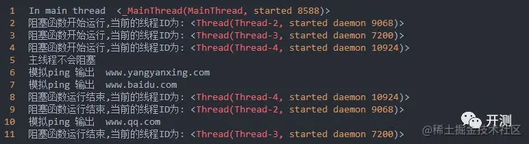 主线程不会被阻塞,起的四个协程函数几乎同时返回的结果,但是注意,协程所在的线程和主线程不是同一个线程,因为此时事件循环loop是放到了另外的子线程中跑的,所以此时这四个协程放到事件循环的线程中运行的。