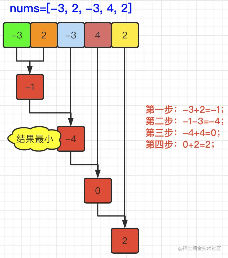 那么,我们先不去考虑startValue是多少,假设这个值已经确定了,那么给定我们一个数组nums=[-3, 2, -3, 4, 2]的时候,我们的计算过程是:startValue -3 +2 -3 +4 +2,那么题目要求,要确保对于每次与nums数组中的元素进行相加计算的时候,都要保证当时的结果是大于等于1的。既然是这样,那么我们暂时先排除掉startValue,只是就nums数组来看一看,在累加计算的过程中,每一步的结果是多少。如下是具体的操作步骤,请见下图: