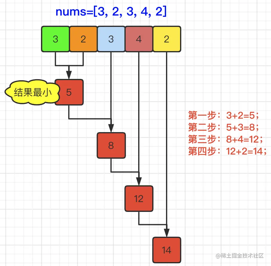 除了刚刚说的一种情况之外,其实还存在另外一种情况,就是在每一步的计算过程中,结果都是大于等于1的。我们可以举个列子,假如给定我们一个数组为:nums=[3, 2, 3, 4, 2],那么我们还是按照上面的方式,先不去考虑startValue的具体值到底是什么,我们只计算nums中的元素,在累加计算的过程中,每一步的结果是多少。如下是具体的操作步骤,请见下图: