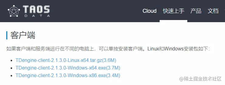 打开涛思数据官网,找到客户端安装包:(下载TDengine-client-2.1.3.0-Windows-x64.exe(3.7M))