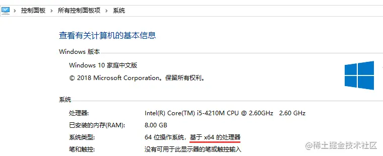 根据你使用的电脑系统,选择下载你需要的安装包即可,我这里选择下载"TDengine-client-2.1.3.0-Windows-x64.exe(3.7M)";不确定电脑配置的同学,可以打开控制面板 --> 系统 查看:
