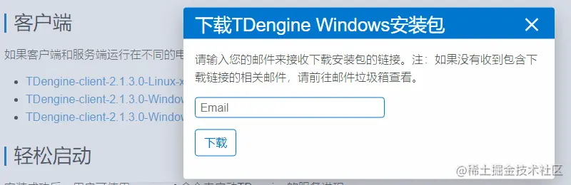 点击链接后,会弹窗下载提示,需要输入一个邮箱。然后你会收到一封官方发来的邮件,点击邮件中的链接直接下载即可(和服务器包下载方式一样),下载成功后,得到一个.exe文件