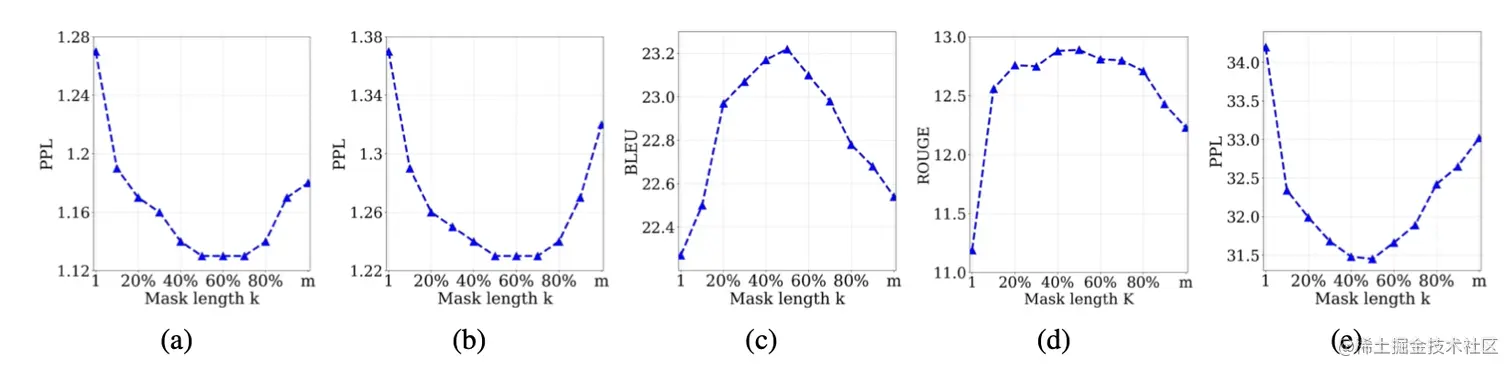 都是对连续token进行MASK,和SpanBert不同的是MASS采用的是固定长度,作者测试了k的不同取值对模型效果的影响。整体上K的取值是总长度的50%左右的时候效果最好。哈哈其实感觉如果用一个均值=50%的分布来采样,可能也有效果提升???