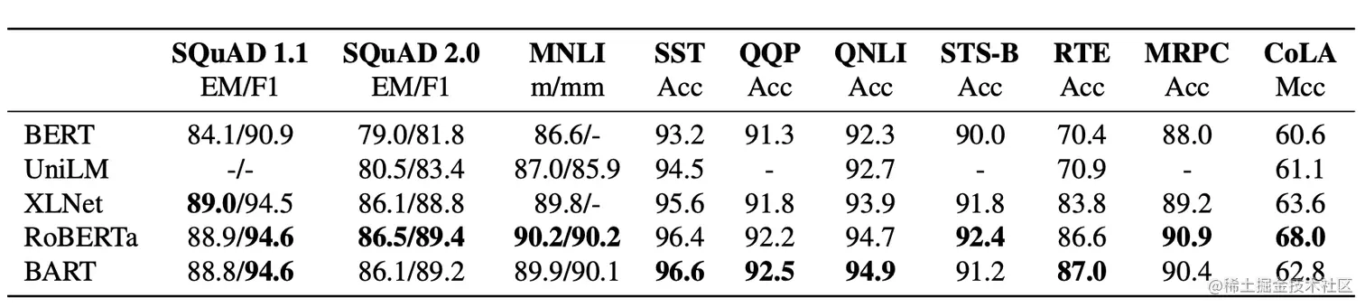 再来关注下阅读理解任务,整体上BART和Roberta效果不相上下,所以BART在生成能力上的提高并没有以牺牲双向理解能力为代价