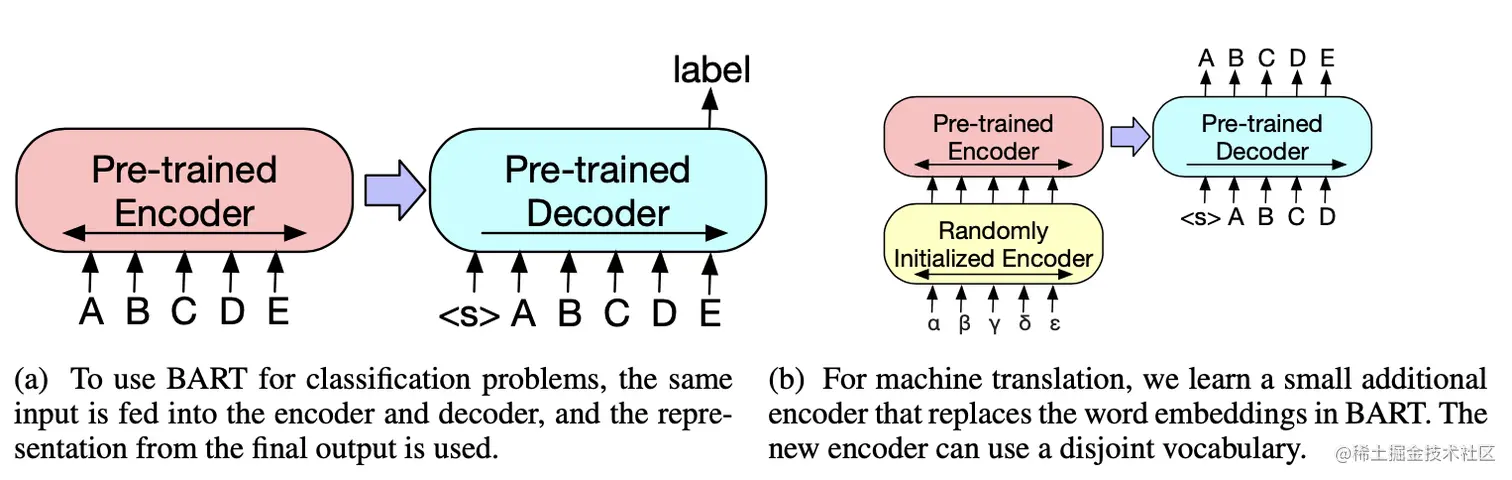 - 分类任务:Encoder输入,Decoder递归,用BART在Decoder的末尾加入了[END]token的Embedding作为文本表征