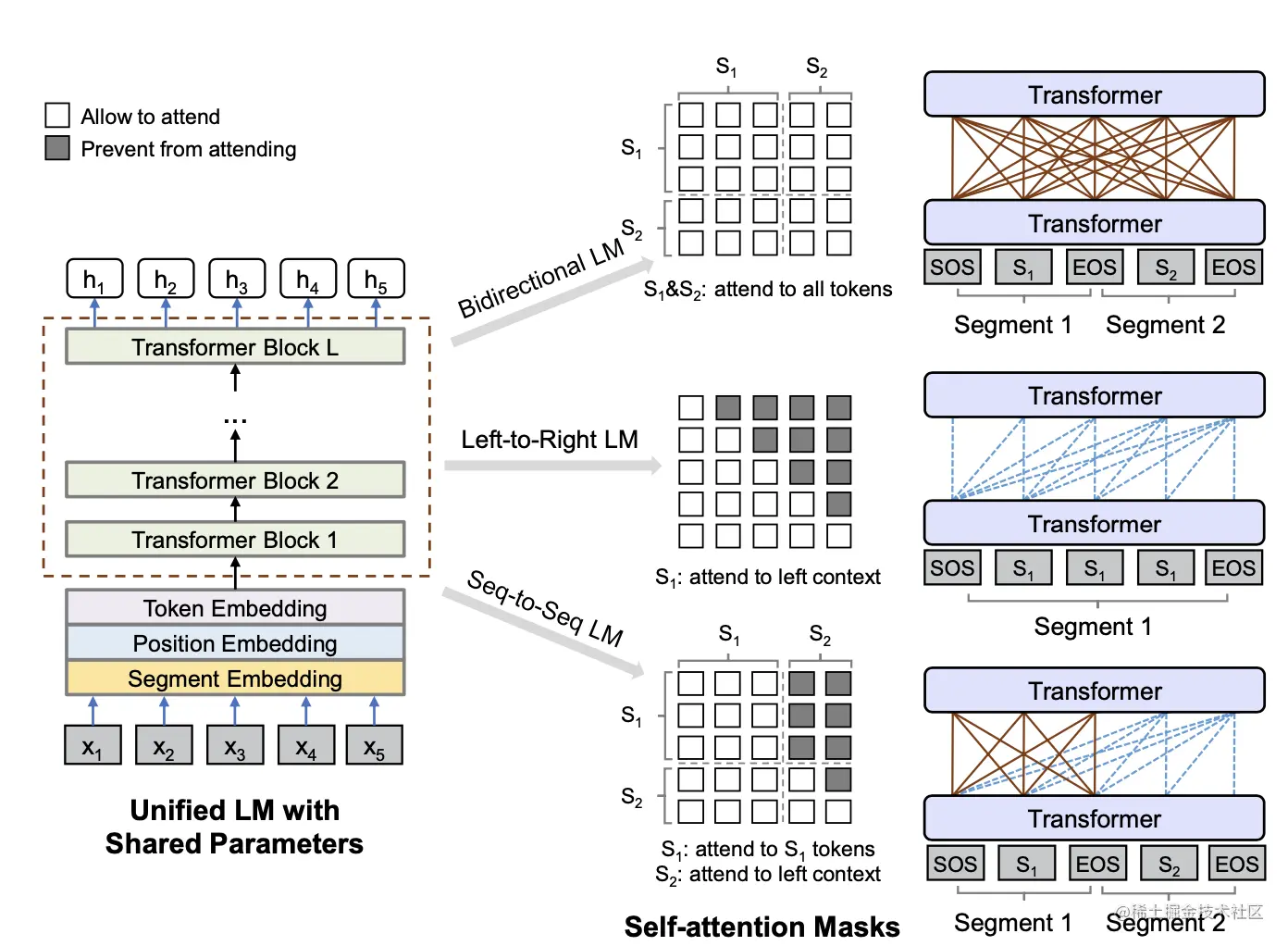 针对以上三种任务的输入略有差异,其中单向LM只有1个segment ”[SOS] s1 [EOS]“,双向LM和seq2seq LM都是2个segment “[SOS] s1 [EOS] s2 [EOS]”