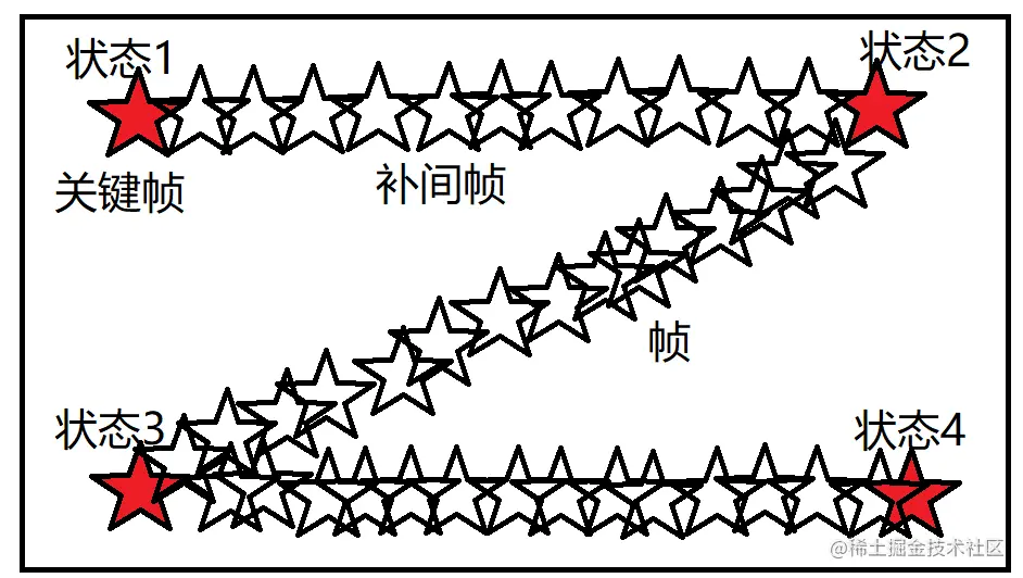关键帧动画:由开发者指定几个特别的状态(关键帧),浏览器自动补全中间的补间帧,合成一个完整的动画。