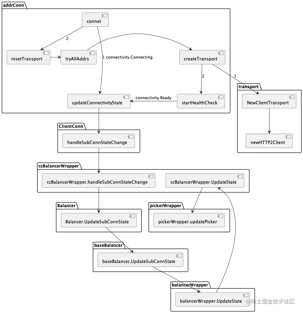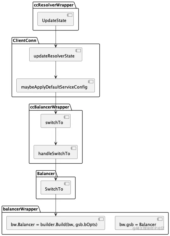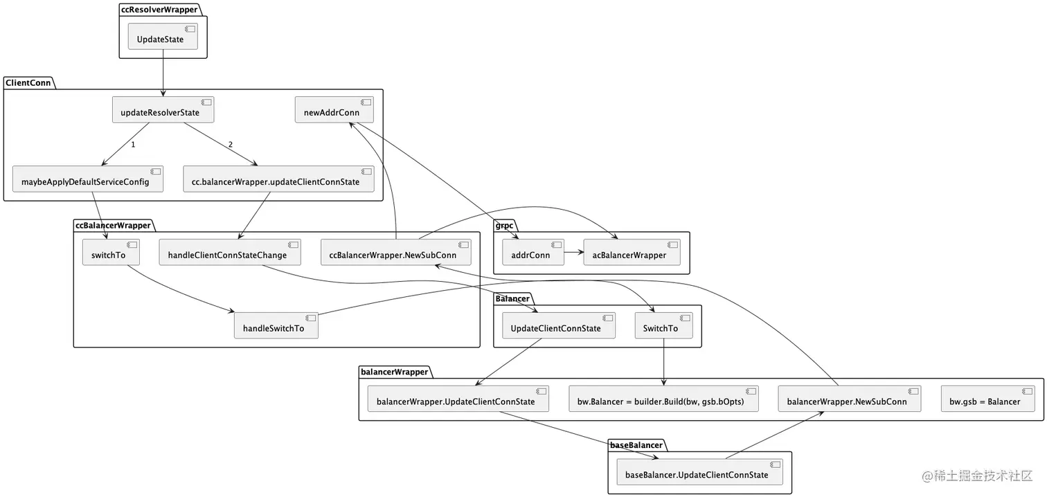 当监听到服务状态的变更后(首次启动或者通过Watch监听变化)调用 ccResolverWrapper.UpdateState 触发更新状态的流程,各模块间的调用链路如下所示: