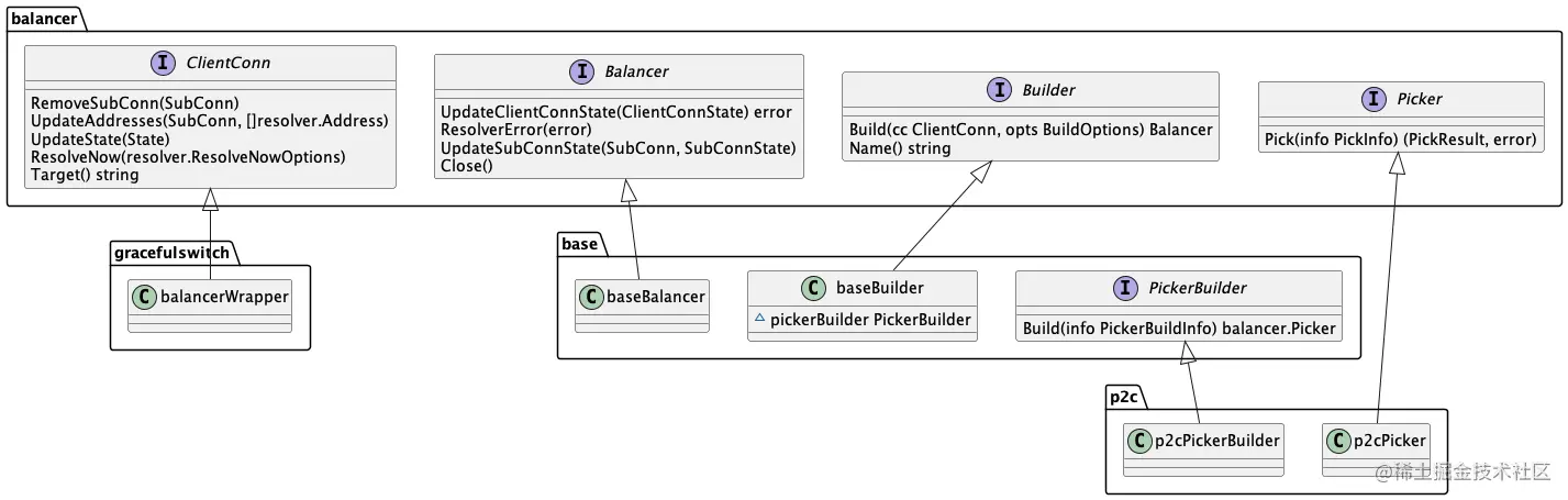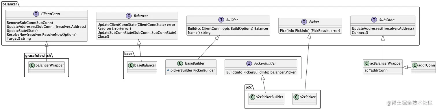 在go-zero中并没有实现 balancer.Builder 接口,而是使用gRPC提供的 base.baseBuilder 进行注册,base.baseBuilder 实现了balancer.Builder 接口。创建baseBuilder的时候调用了 base.NewBalancerBuilder 方法,需要传入 PickerBuilder 参数,PickerBuilder为接口,在go-zero中 p2c.p2cPickerBuilder 实现了该接口。