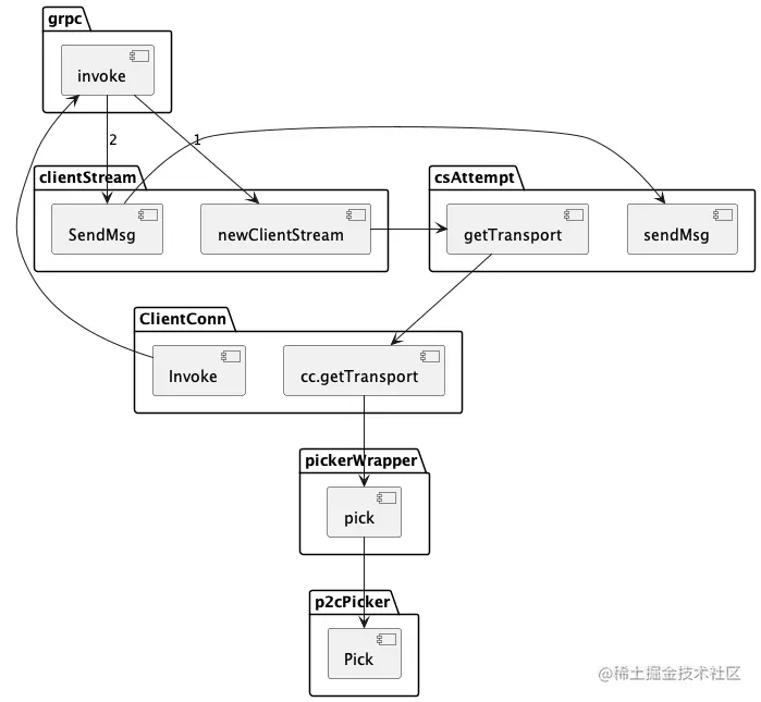 如下为发起请求的调用链路,最终会调用p2cPicker.Pick方法获取连接,我们自定义的负载均衡算法一般都在Pick方法中实现,获取到连接之后,通过sendMsg发送请求。
