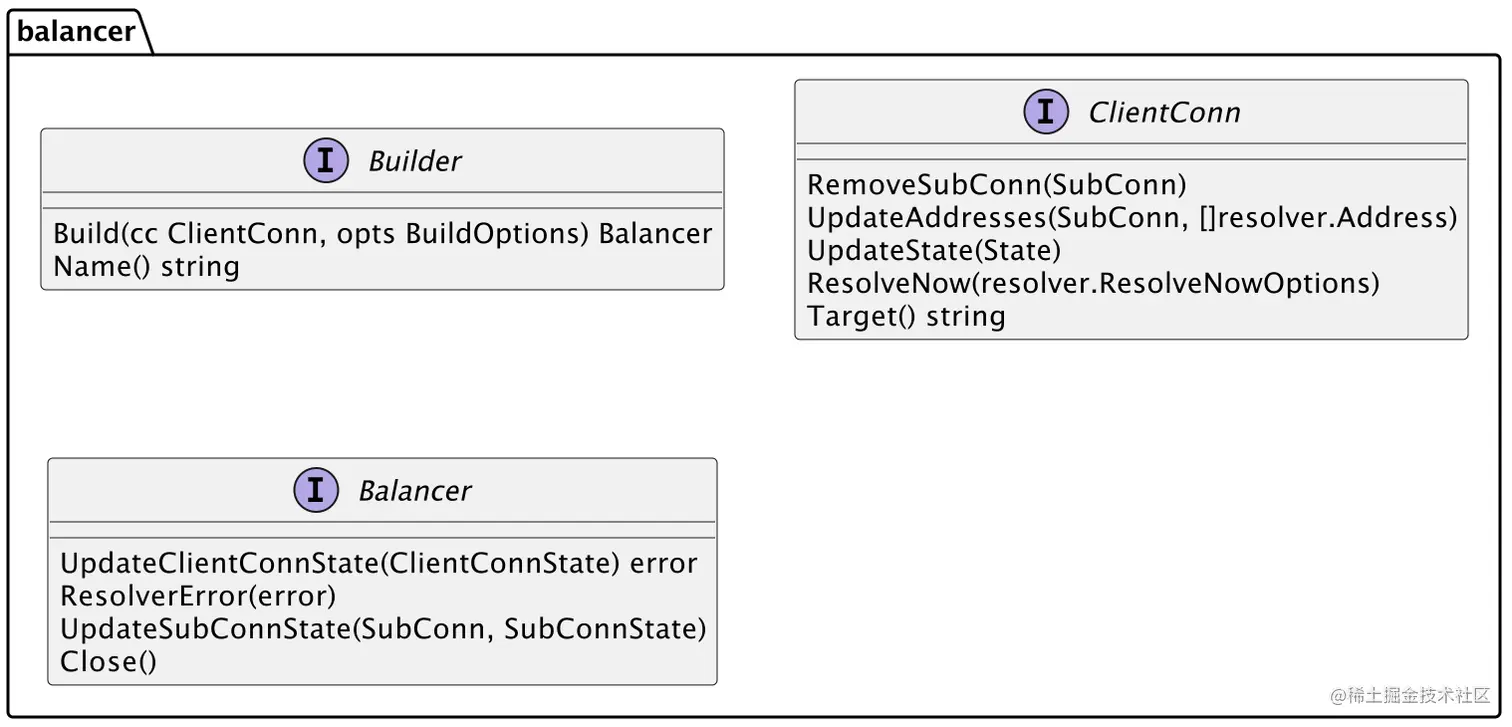 Register的参数Builder为接口,在Builder接口中,Build方法的第一个参数ClientConn也为接口,Build方法的返回值Balancer同样也是接口,定义如下: