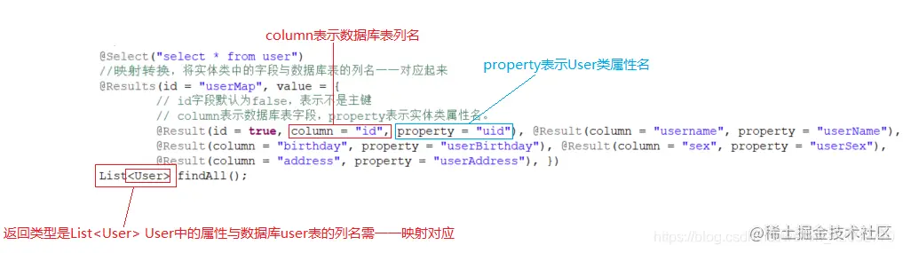 @Result(id = true, column = "id", property = "uid"), @Result(column = "username", property = "userName"),