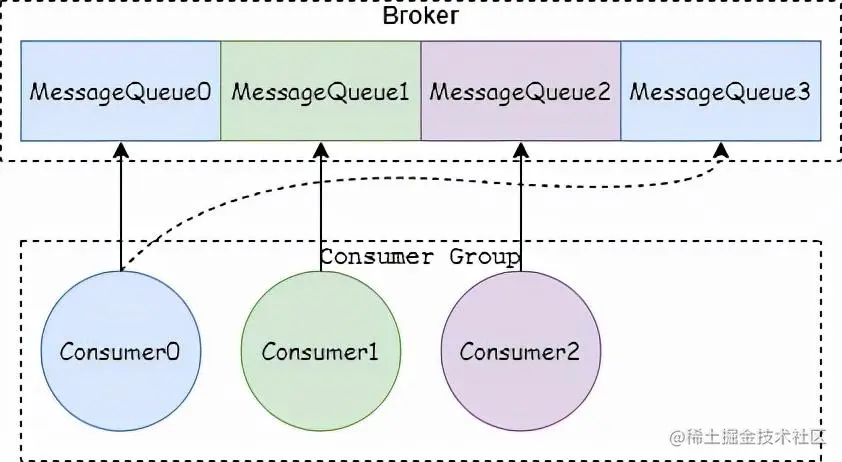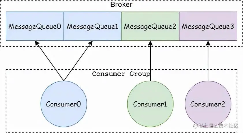 - 如果不可以平分,就使用 MessageQueue 总 数量对消费者数量求余数 mod;