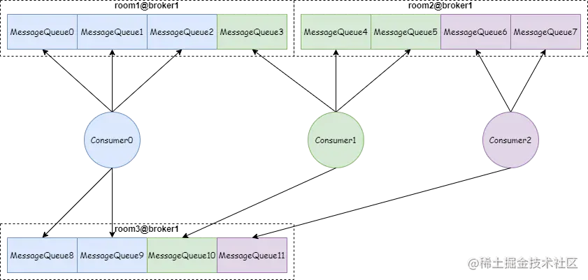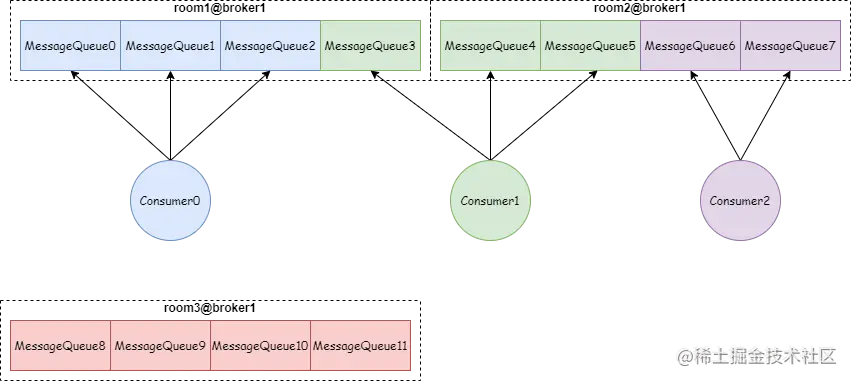 这种方式 Consumer 只消费指定机房的 MessageQueue,如下图:Consumer0、Consumer1、Consumer2 绑定 room1 和 room2 这两个机房,而 room3 这个机房没有消费者。