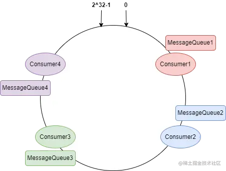 把所有的消费者经过 Hash 计算分布到 Hash 环上,对所有的 MessageQueue 进行 Hash 计算,找到顺时针方向最近的消费者节点进行绑定。如下图: