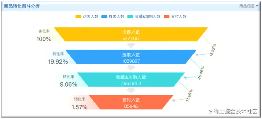 从客户进入网站到支付之间,存在层层的客户流失环节,通过统计图,企业可以清晰地对各个环节的客户转换率进行分析,对症下药,重视客户价值。