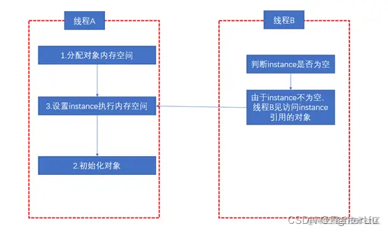 如果instane 不加volatile,上面的2,3可能会发生重排序。假设A,B两个线程同时获取,A线程获取到了锁,发生了指令重排序,先设置了instance指向内存空间。这个时候B线程也来获取,instance不为空,这样B拿到了没有初始化完成的单例对象(如下图)