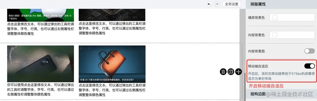 - 使用媒体查询 媒体查询可以根据收件人的设备屏幕宽度来确定电子邮件的风格,帮助企业为移动设备创建响应式电子邮件。闪闪编辑器可以让客户自主设置,某一行是否需要移动端自适应,并提供了邮件预览的效果。(见下图)