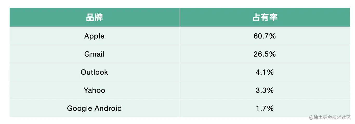 因为电子邮件代码兼容性的问题,使得企业需要知道,收件人是如何查看电子邮件的。使用什么设备,什么客户端,什么操作系统。根据 Litmus 的统计,2022年3月最受欢迎的三大电子邮件客户端是 Apple、Gmail 和 Outlook。