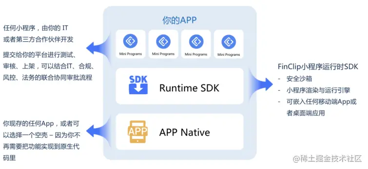 凡泰极客借鉴互联网成熟小程序技术方案,推出FinClip小程序容器技术,任何 App 均可以通过引入 FinClip 小程序运行时 SDK 来获得运行小程序的能力,同时,它还提供一个后台管理系统,统一管理小程序的上架和下架,以及收集和分析小程序数据,对于开发人员,可谓是极其便捷了。