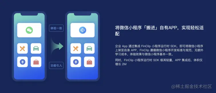 完全遵循兼容微信小程序的开发标准与规范的FinClip,可以让你在已经开发好了一个微信小程序下,不改一行代码直接放进你的 App 里面,运行效果和在微信上面保持一致,不必额外二次开发和改造,大大节省了人力成本。